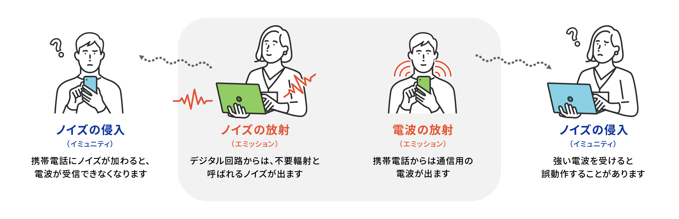 電子機器がケーブルや基盤配線を通じて外部へ伝わる不要な電磁波(ノイズ)のことです。これらのエミッションが強過ぎると、周囲の機器に悪影響を及ぼす可能性があり、ノイズを抑制するために、各国・地域または製品のカテゴリーにおいて規格が定められており、製品開発においてはこれらの規格を満たすことが求められます。規格を満たさないと製品を市場にだすことは出来ません(販売停止やリコールの可能性も)
