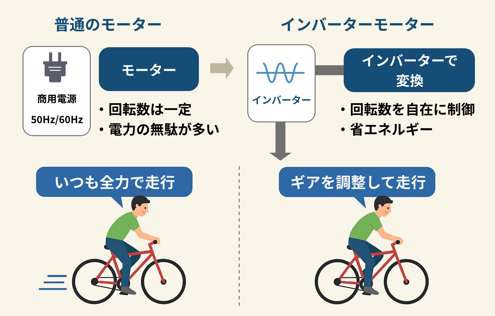 【商用電源】 → 【インバーターで変換 (周波数・電圧可変)】 → 【モーター】