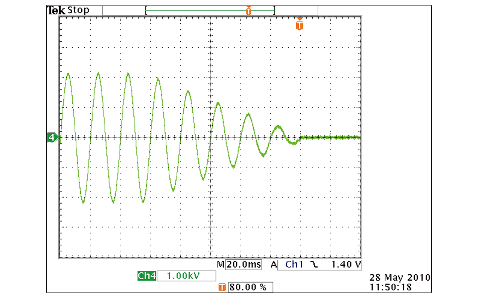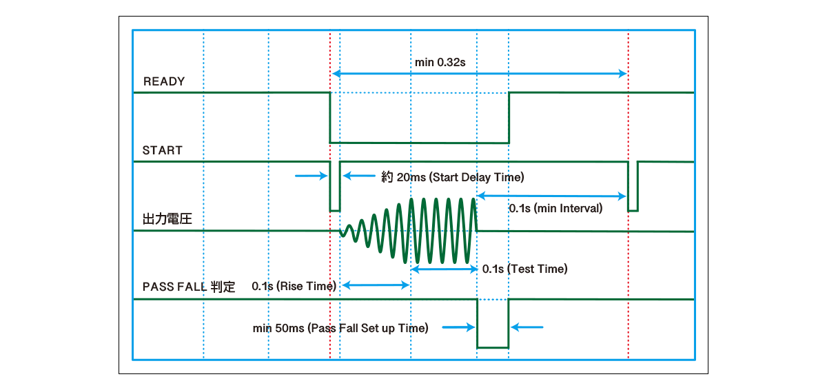 AC耐電圧試験のPASS判定時には、徐々に試験電圧を降下させることができます。電圧降下時間は0.1s固定(OFFも可)です。