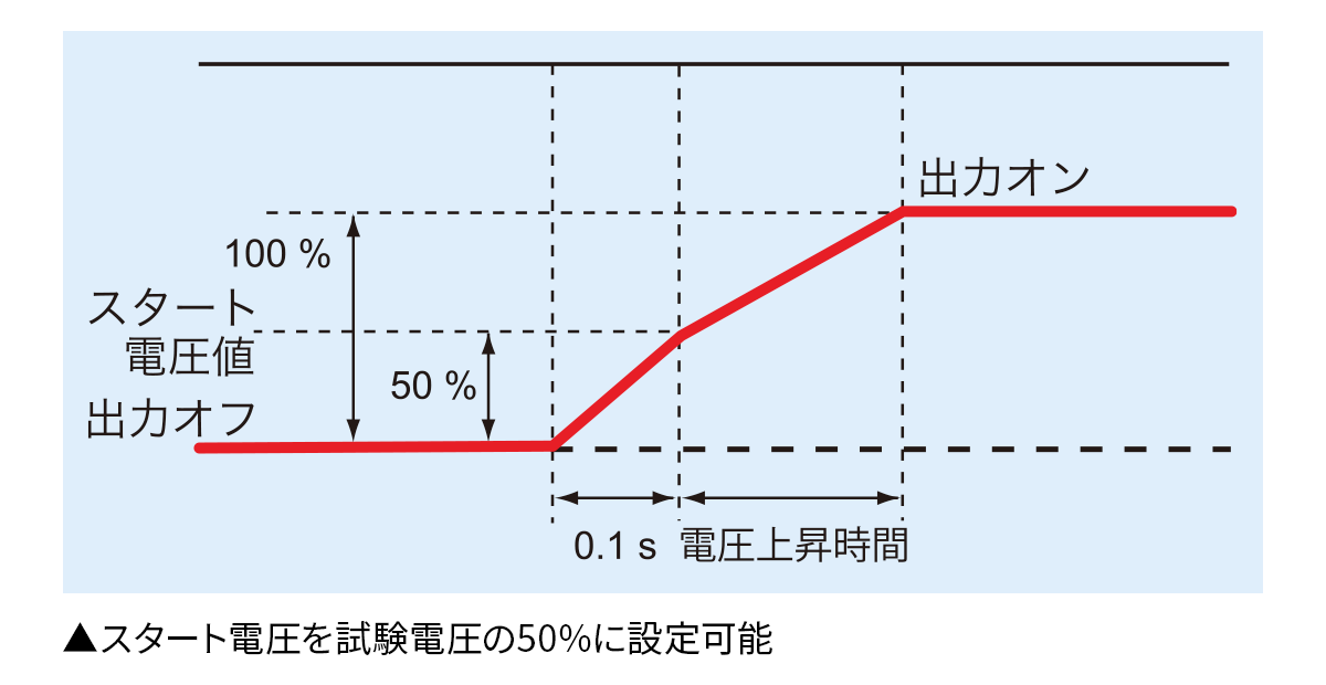 AC耐電圧試験では設定電圧まで徐々に電圧を上昇させるライズタイムコントロール機能を搭載。電圧上昇時間は0.1s~10.0sまで0.1s分可能で設定可能です。