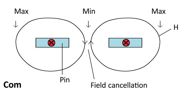 LVDSペアに差動モード電流が流れる場合、ピン間の磁界は加算されます(図4)。ピン間の磁界強度は、ピンペアの外側の磁界強度よりも高くなります。LVDSペアにコモンモード電流が流れる場合、ピン間のコモンモード電流の磁界は打ち消されます(図5)。つまり、LVDSペアのピン間では磁界強度が低く測定されますが、LVDSペアの外側では磁界強度が高くなります。