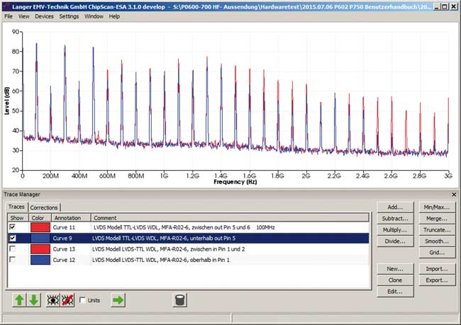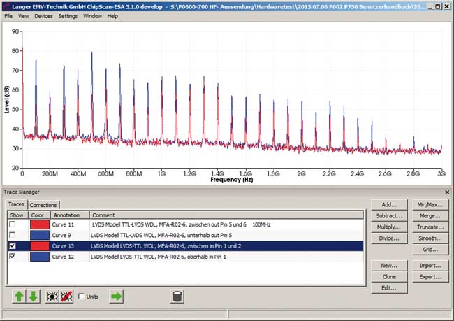 これらの関係に基づいて、MFA-R 0.2-6近傍界プローブを用いた測定において明確化に重要な2つの測定箇所を定義できます。プローブのコイル面は、LVDSピンペア間(図2)とLVDSピンペアの横(図3)に配置する必要があります。図6と図7に測定結果を示します。赤い曲線はLVDSピンペア間の測定結果(図2)を示しています。青い曲線はLVDSピンペアの外側の測定結果(図3)を示しています。