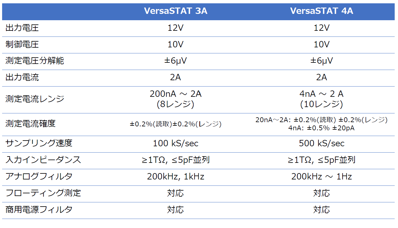VersaSTAT Aシリーズでは、VersaSTAT 3Aの他にも、4nA電流レンジ・高速サンプリングに対応したVersaSTAT 4A もございます。