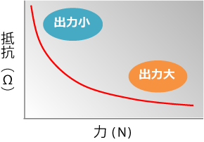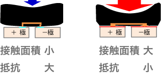 | ■力に応じて導電部材と電極の接触面積が増減 | ■力の変化を抵抗変化として検出 |