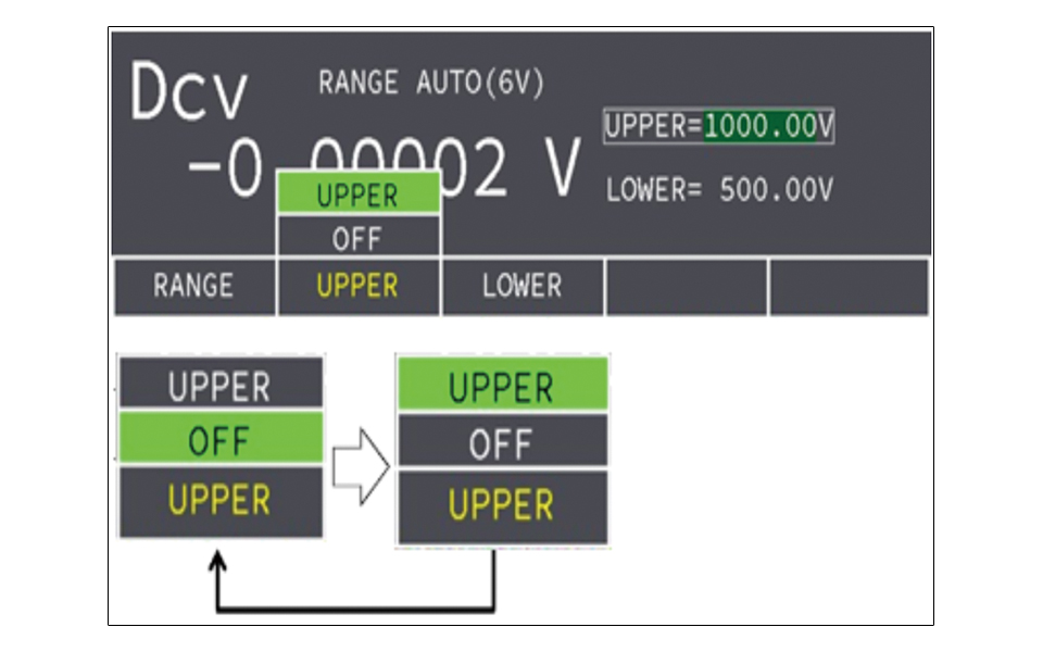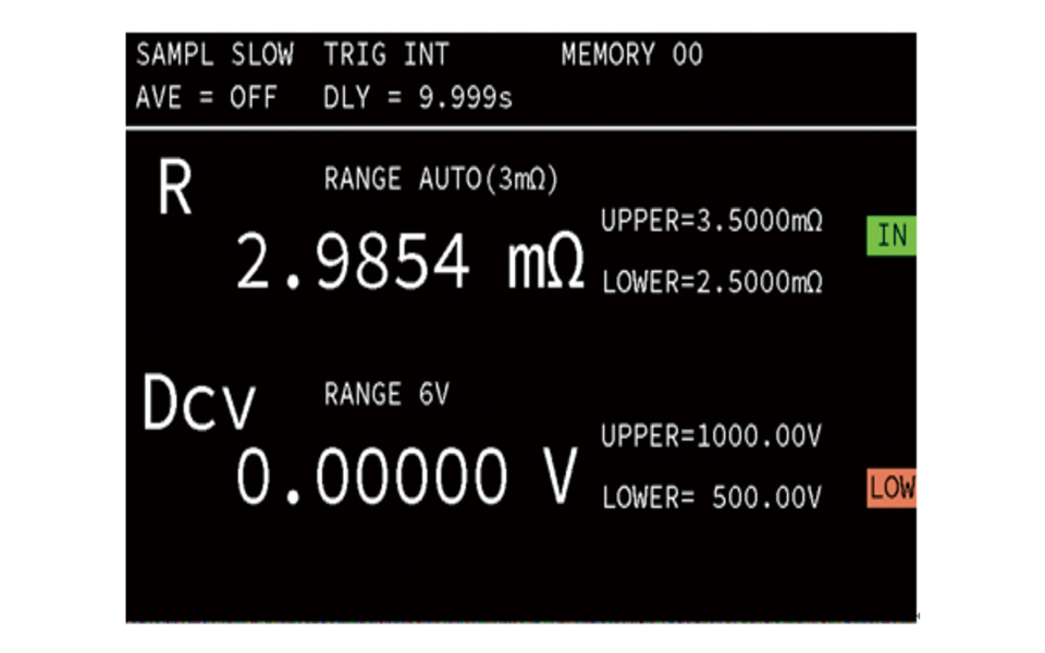 コンパレータ機能によりUPPER/LOWERを設定することができ、抵抗と電圧を独立したコンパレータで同時に判定することができます。判定結果は、ディスプレイに表示されます。外部I/Oは信号出力に使用できます。