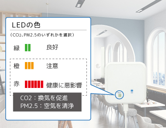 本体LEDで空気質レベルを表示。点灯しているLEDの数が少ないほど、空気がきれいな状態です。LED表示する項目(CO2またはPM2.5)は、アプリで選択します。