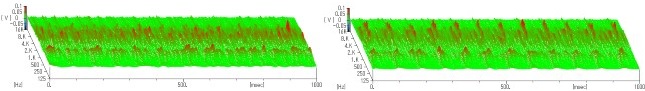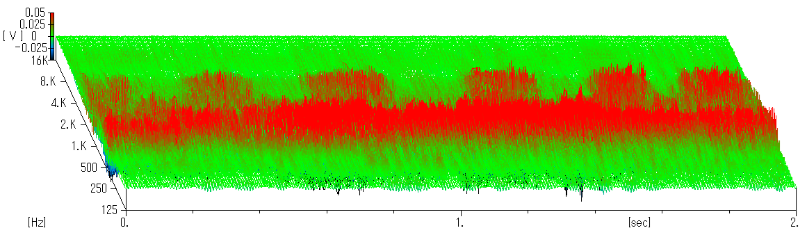 ウェーブレット変換を応用・発展させた可視化処理により、時間・周波数・電圧(音圧)の軸に音の特徴を三次元で表します。