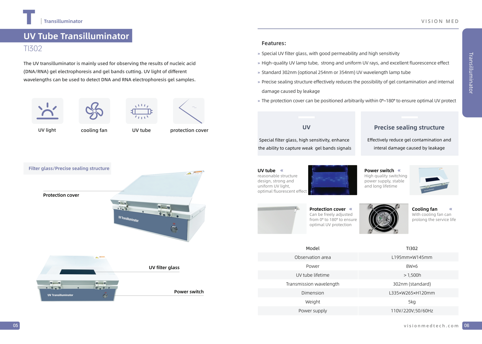 - 標準302nm(オプションで254nmまたは354nm)波長のUVランプ。
