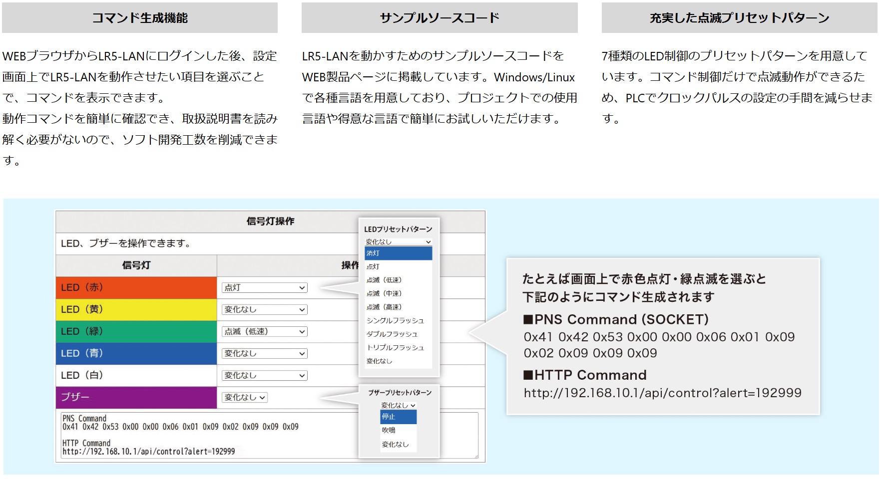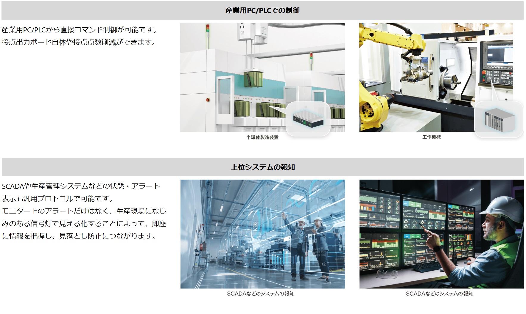 産業用PC・PLCとLAN接続でき、Ethernet通信で制御可能な積層信号灯です。 HTTP・Modbus/TCPなどの汎用プロトコルに対応し、簡単に操作可能。