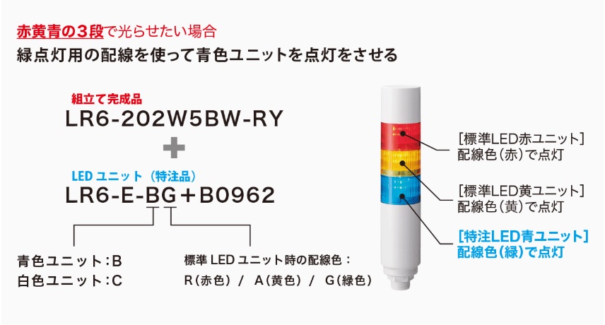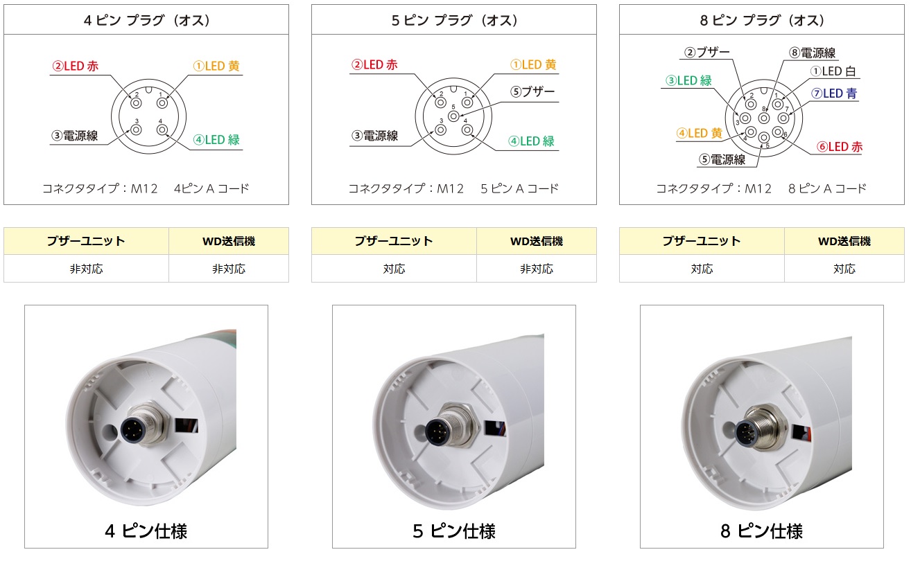 4ピン仕様および5ピン仕様では、標準品のLEDユニット青・白及びマルチカラーユニットを使用できません。 青・白の点灯色は特注品のLEDユニットをご使用ください。