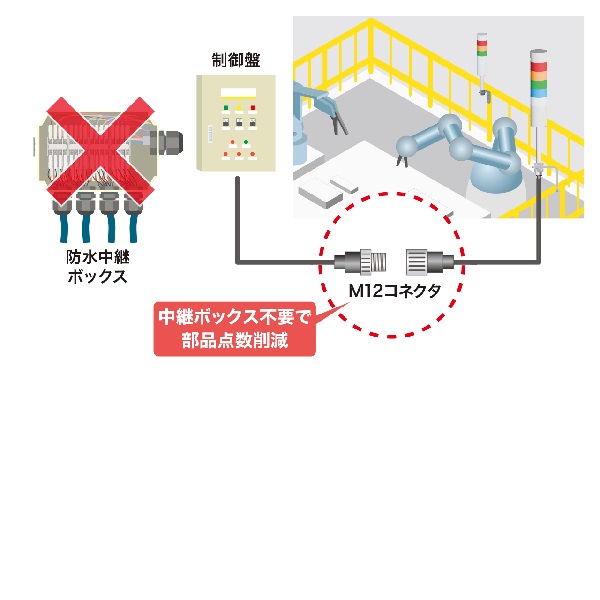 M12コネクタ配線によって防水性が 確保されるため 中継ボックスの設置が不要です。配線もシンプルになるため、ライン移設時のメンテナンス性が向上します。