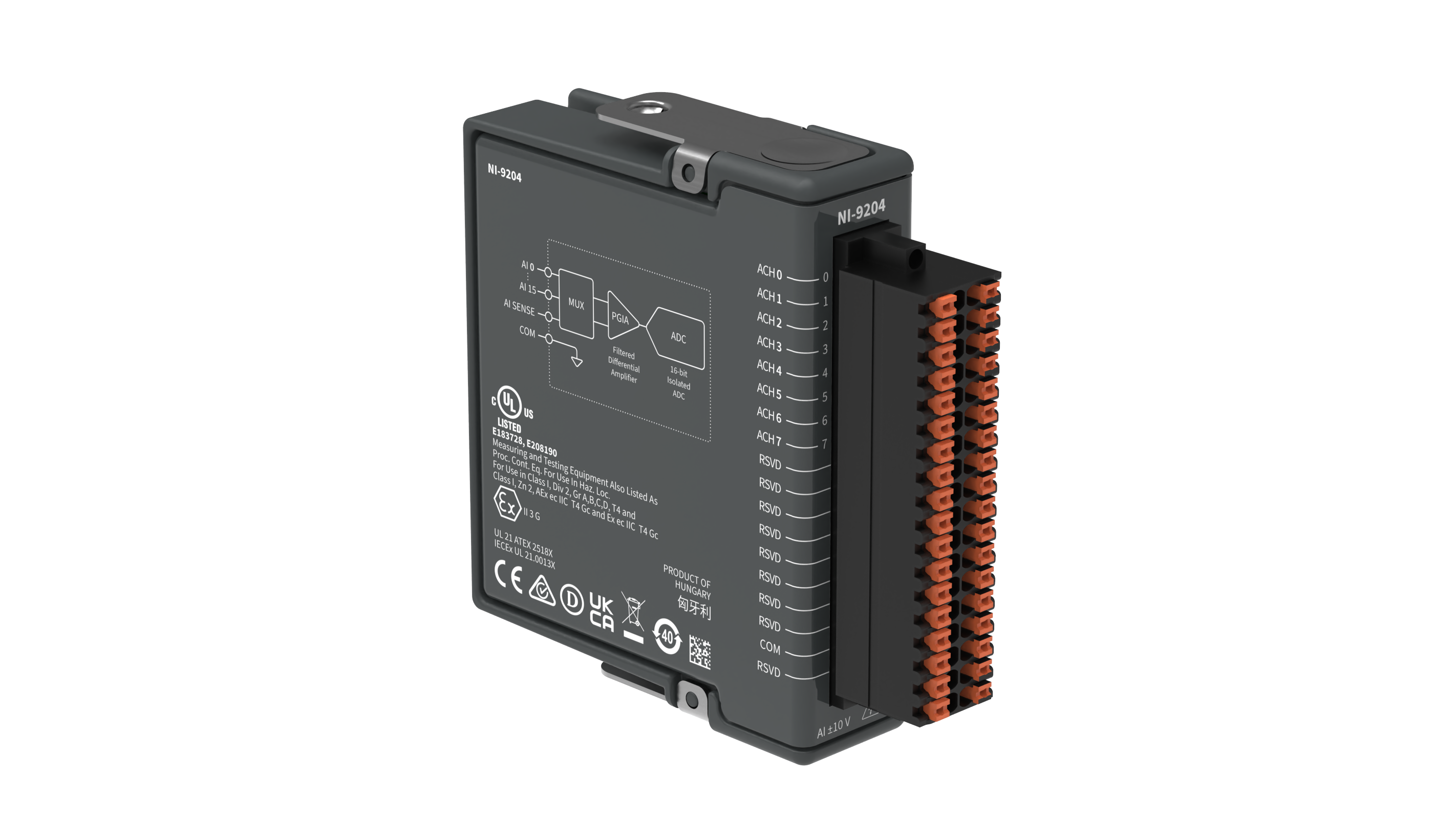 NI-9204は最大16のシングルエンド、または8つの差動電圧入力、16ビット、250KS/sのサンプリングレートを備えています。 ±10Vから±0.2Vまでの4つのプログラム可能なレンジを備えています。 本製品には、36ピンバネ端子または、37ピンD-SUBコネクタのオプションがあります。