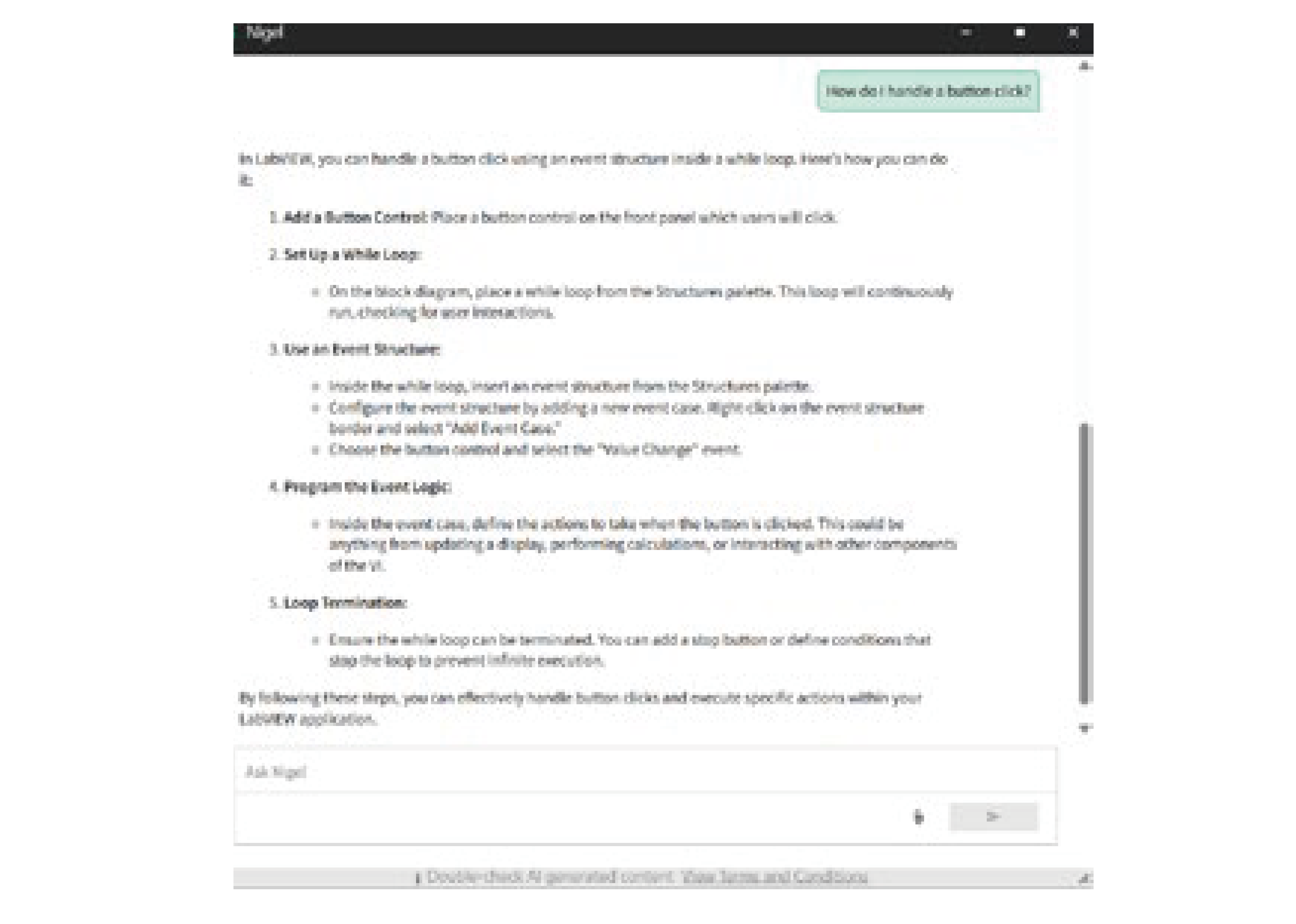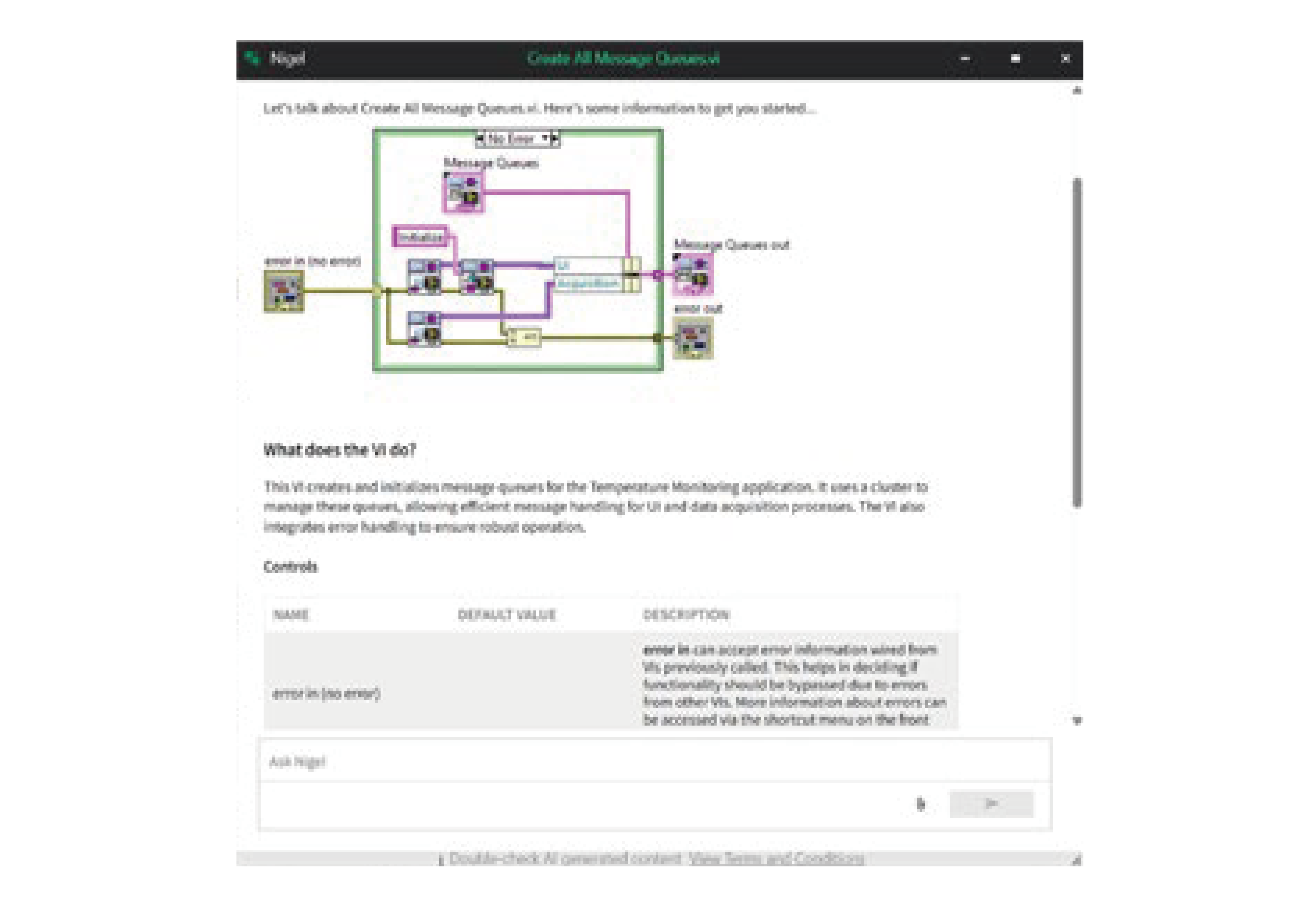 Nigelは、LabVIEWプログラミングの概念に関する質問にお答えし、リアルタイムで状況に応じたアプリケーションのサポートを提供します。