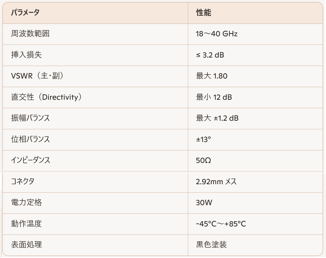 180° 2.92mm ハイブリッドカプラ(18–40GHz)は、マイクロ波およびミリ波帯で使用される汎用性の高い受動部品です。