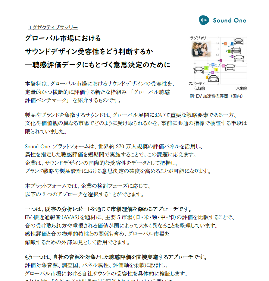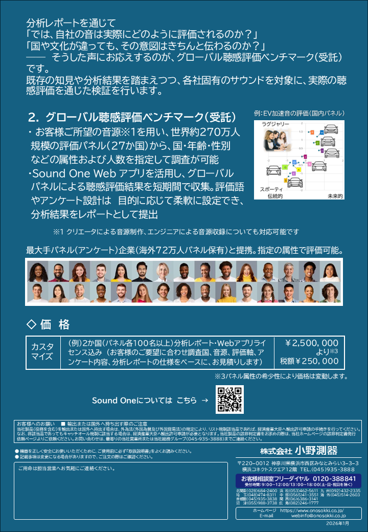 ・Sound One web アプリによって、グローバルパネルの聴感評価結果を短期で収集し分析レポートを提出 更なる詳細は資料のQRコードからどうぞ。