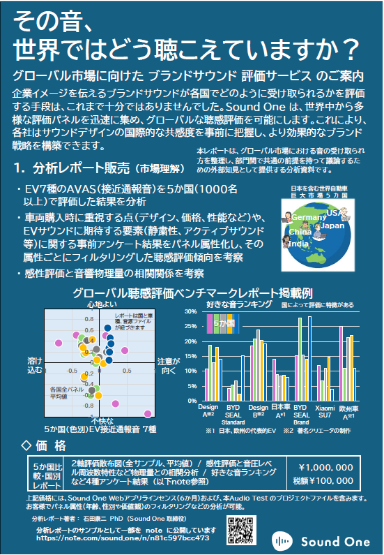 ・Sound One web アプリによって、グローバルパネルの聴感評価結果を短期で収集し分析レポートを提出 更なる詳細は資料のQRコードからどうぞ。