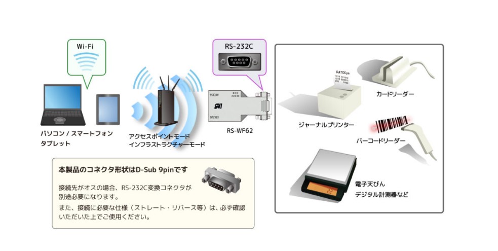 RS-WF62は、ルーターなど通信機器を介して通信するインフラストラクチャーモードと、RS-WF62をアクセスポイントとして直接通信をおこなうアクセスポイントモードに対応。\nインフラストラクチャーモードの設定変更後は、本製品のDIPスイッチ(1番)の変更のみで両モードを切り替えて使用可能。\n離れた場所にある、固定された機器を使用する場合も、ストレスなくRS-232C機器が使用可能。\nバーコードスキャナー、電子天びん、磁気カードリーダー、RF-IDタグリーダーなどを接続できます。\n※TA・モデムには対応していません。\n※RS-232Cポートに接続して使用するシリアルマウスはサポートしていません。
