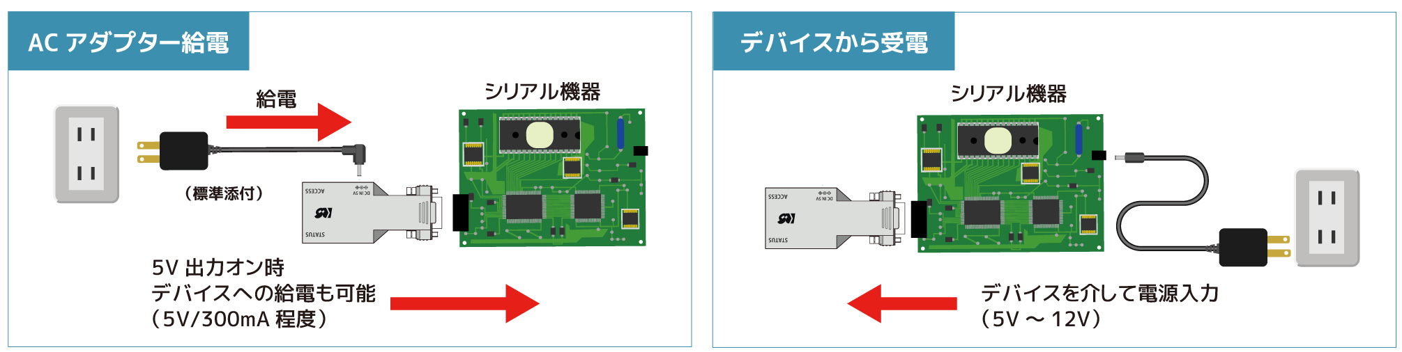本製品の駆動電源は、標準添付ACアダプターからの給電のほか、接続デバイスからD-Sub 9番ピンを介し5V~12V電源の受給も可能です。\nまた、本製品のDIPスイッチの5V出力をオンにしてACアダプターを接続すると、D-Sub 9番ピンから外部の機器へ5V/300mA程度の電源を供給することもできます。
