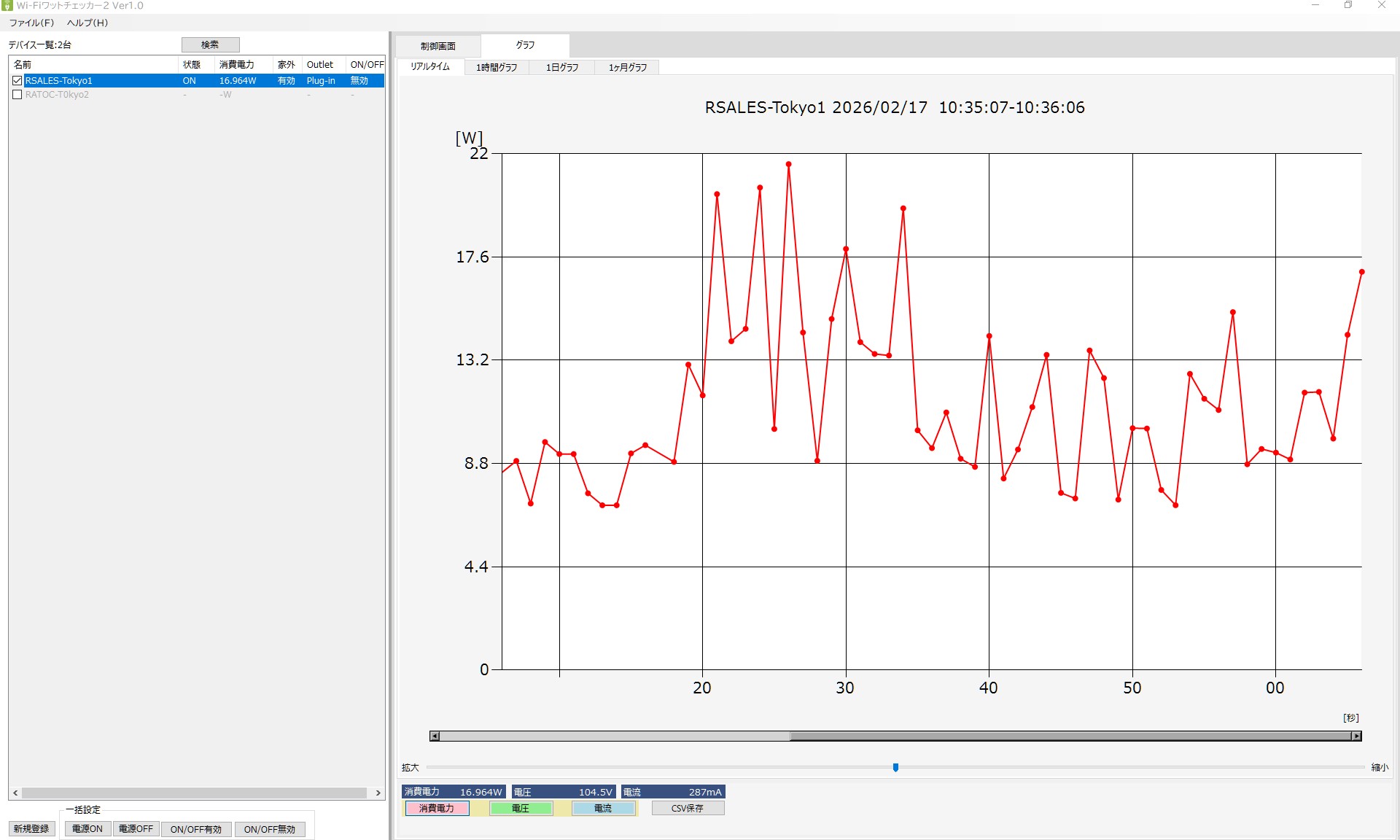 リアルタイム監視は専用アプリケーションの「リアルタイム」タブで行います。後日ログを確認し解析を行う場合には「1時間グラフ」「1日グラフ」「1ヶ月グラフ」のタブから確認します。リアルタイム計測画面、累積ログ確認画面では計測したデータをCSVファイルに保存することができます。(「測定データをCSVファイルに書き出し可能」をご参照ください。)
