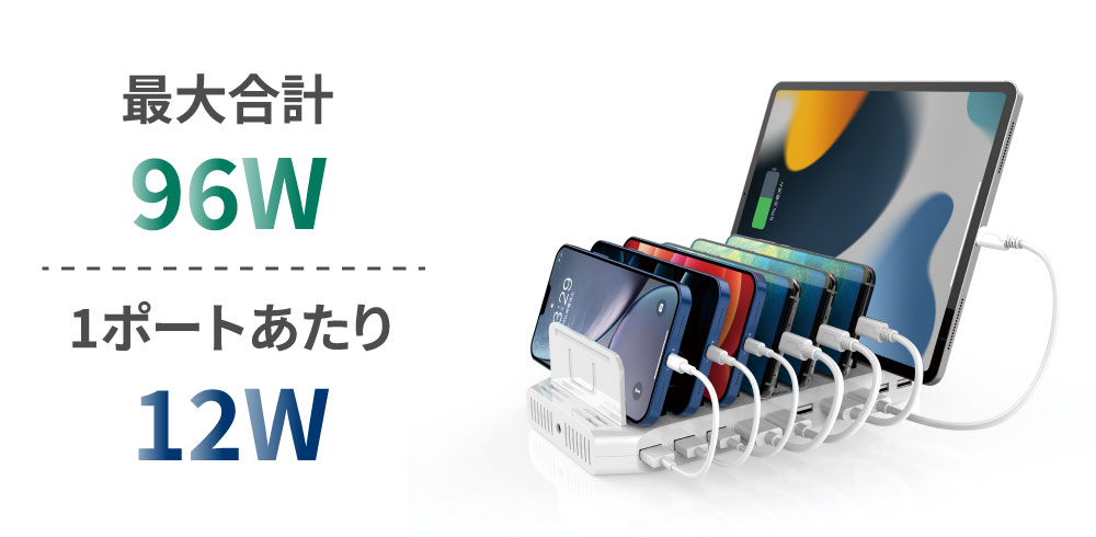 本製品は10ポート合計で最大96W、1ポートあたり最大12Wの出力に対応。\n「12Wで8台」「10Wで9台」など、最大出力を越えない範囲であれば自由に組み合わせが可能です。