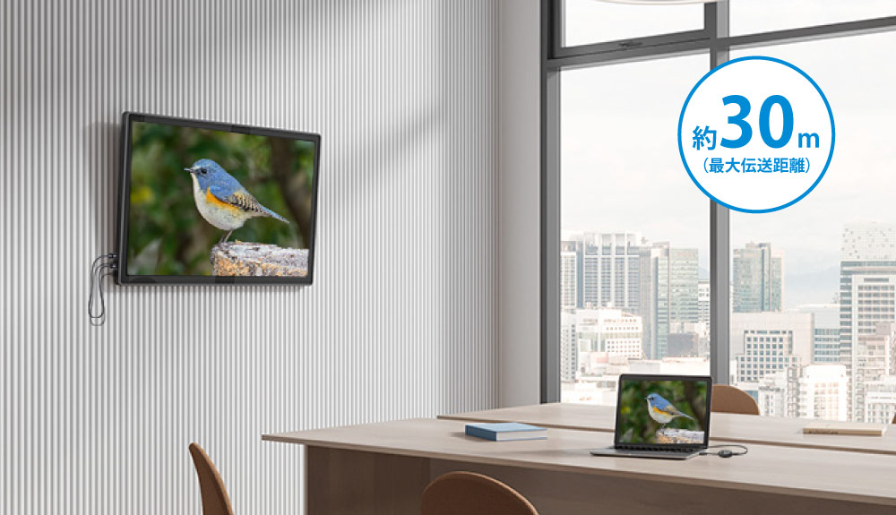 本製品は、離れた場所のテレビやディスプレイにワイヤレス出力することが可能です。広い会議室など、オフィスで自由な配置が可能です。