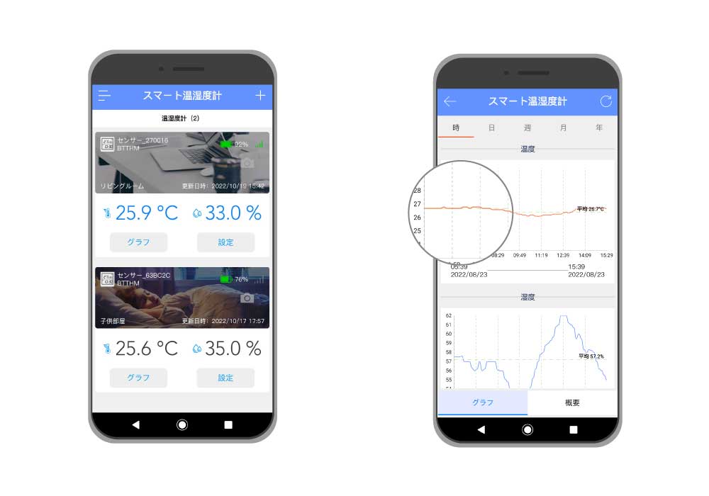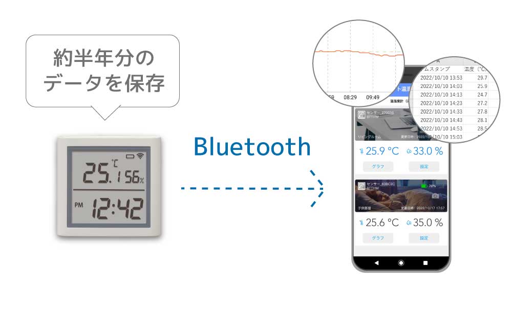 スマホが接続されていないときでも、自動で本体メモリにデータを保存。保存可能期間は約6か月分。保存したデータはアプリ接続時にダウンロードでき、グラフ表示やCSVへの書き出しが可能です。