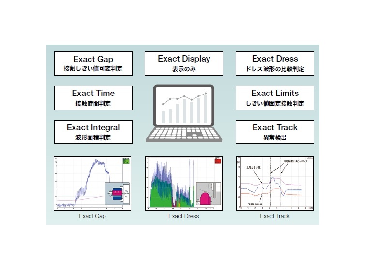 従来のしきい値判定だけでなく、時間判定や積分値判定など、合計7種類の判定プログラム。感度や周波数の自動設定機能(LEARN)、しきい値の自動設定機能(TEACH)も標準装備。AEセンサ以外のセンサ信号(電力、トルクなどのアナログ電圧)も取り込み可能。(Exact Controlカード(Option)+コントローラSB-seriesが必要)波形データはコントローラ本体に自動保存され、データ読み出しも簡単操作。