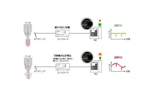 本ATC振れ検出システムは、ツールテーパ部への切粉の嚙み込み等によって生じる工具の振れを検出し、突発的なワークの加工不良を防止するシステムです。 *1:GAP 1mm,2400rpm,当社指定のマスターツールホルダ使用時
