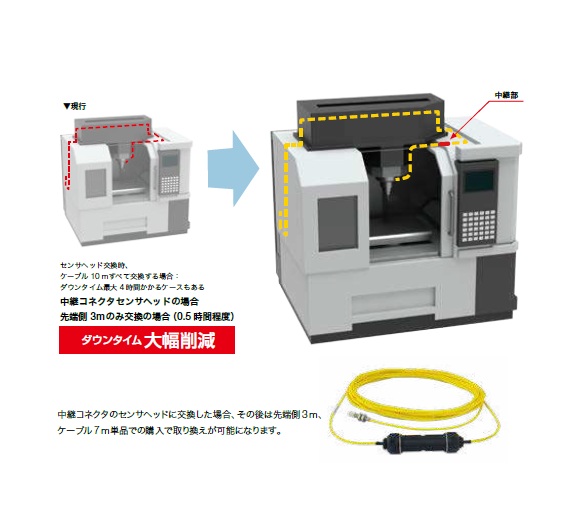 センサヘッドケーブルの途中に中継コネクタを実装。現行10mのケーブルが中継コネクタにより着脱可能になります。先端側(センサ)3m+中継ケーブル7mの構成によりセンサ交換、施工性、メンテナンス性が大幅に向上しました。
