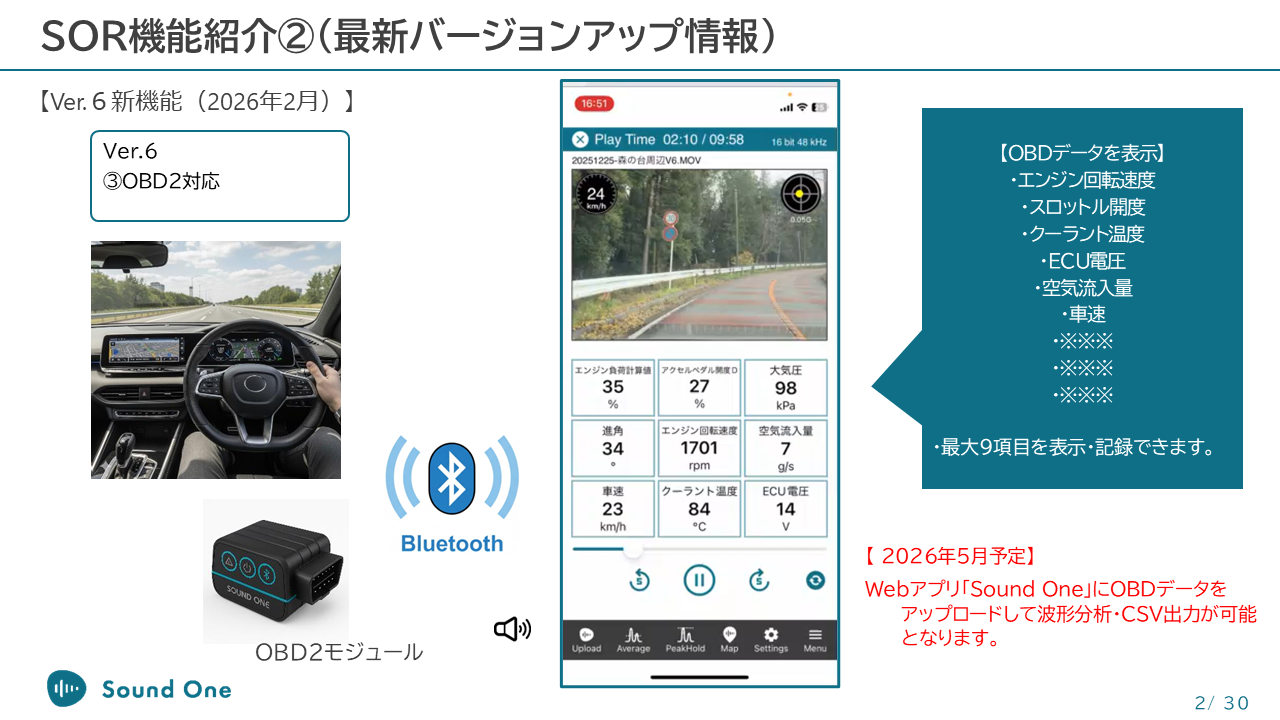 基本データの音・車速・加速度(X/Y/Z)に加え姿勢(ロール/ピッチ/ヨー)、 市販のBluetooth対応OBD2モジュールを使用することで、ECU内部の情報を取得できるようになりました。(収録できる項目は対象車両やOBDモジュールの仕様により異なります)