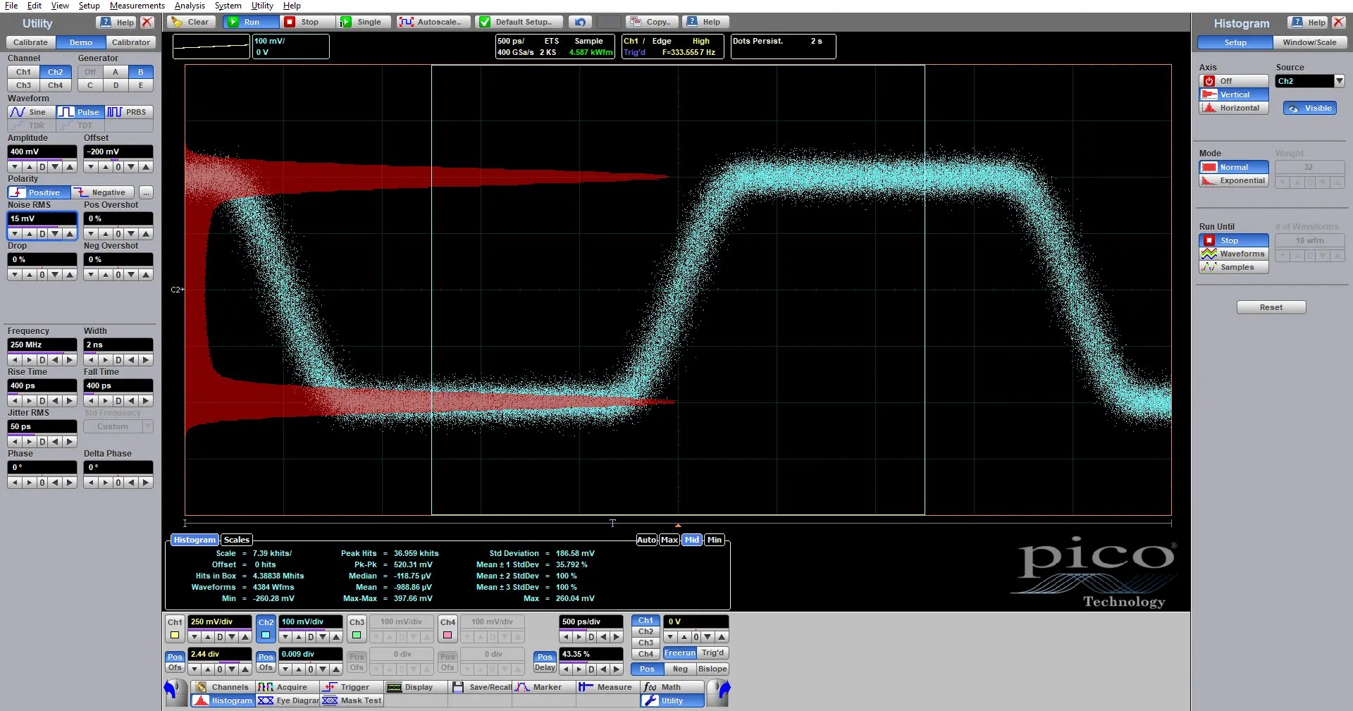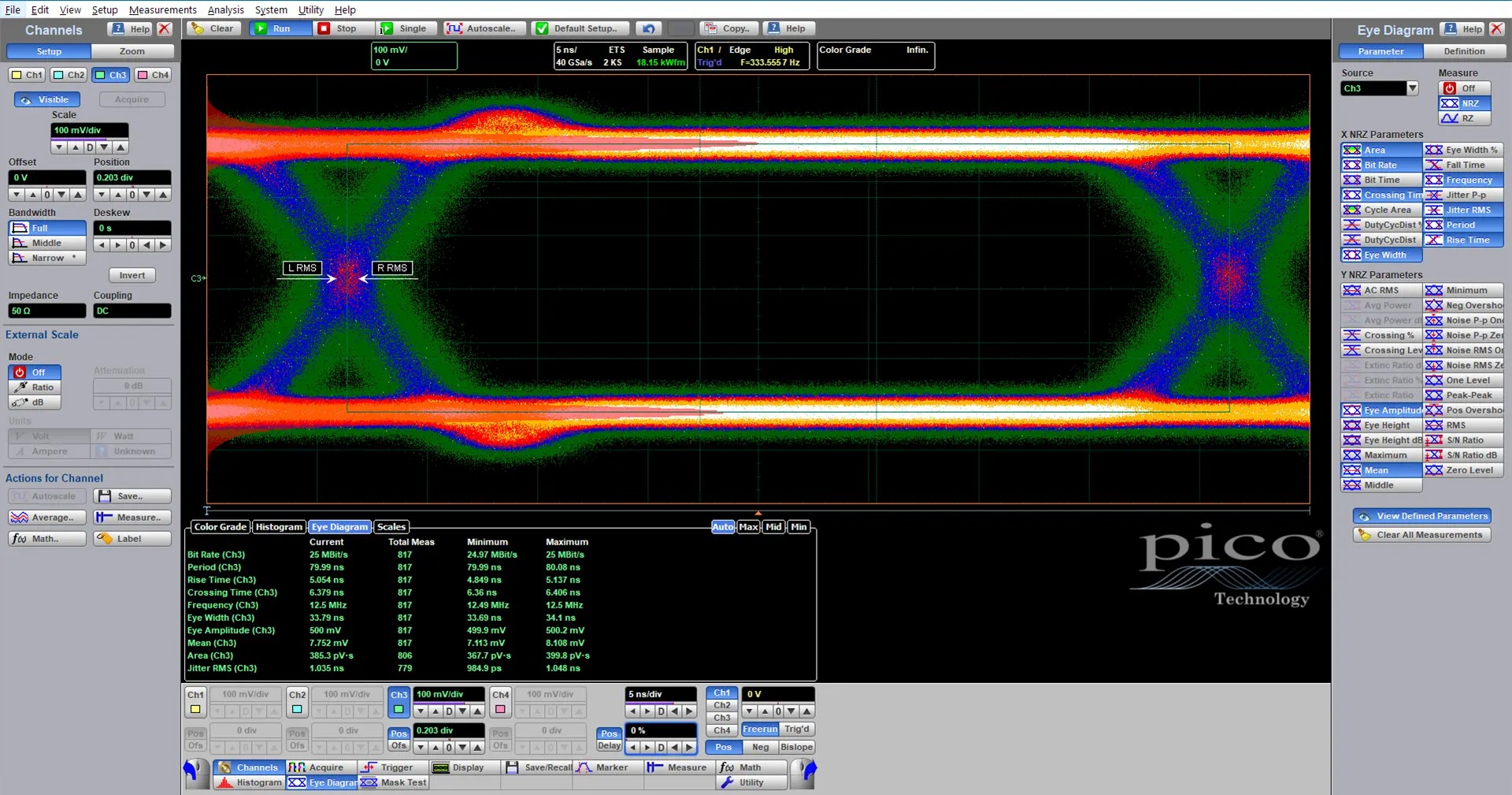 付属のPicoSample4ソフトウエアには、130種類ものパラメータを測定できるアイダイアグラム機能があります。RZ,NRZからPAM4までの信号に対応します。