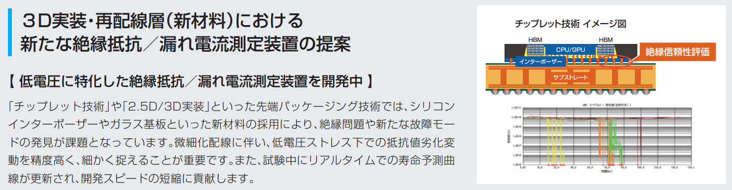 AI、5G、データセンターなどの進化を背景に、基板配線技術は低電圧から高電圧まで幅広く絶縁信頼性の向上が重要視されています。 これらの評価を、より高精度に効率よく連続モニターを行うことができるシステムです。エレクトロケミカルマイグレーションをはじめとした電子部品の寿命評価、絶縁抵抗評価(リーク電流測定)を効率的かつ容易に行えます。