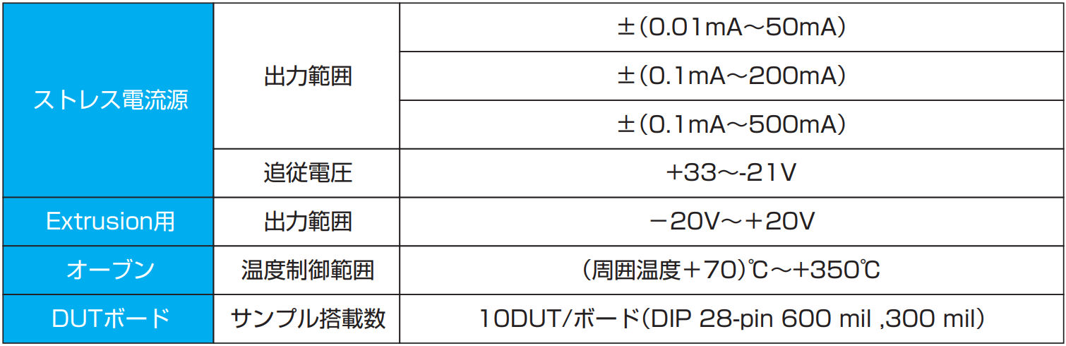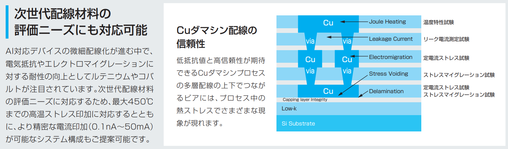 LSIの配線信頼性評価で、高温環境下で電流ストレスを印加し、加速条件下で配線寿命を評価するエレクトロマイグレーション(EM)評価試験用装置です。 多数のサンプルの配線抵抗値の変化や断線に至るまでの時間を長時間にわたりモニタリングします。取得データは、寿命予測に必要な各種パラメータの解析に活用することができ、材料開発からプロセス最適化、信頼性保証まで、次世代半導体デバイスの品質向上に貢献します。