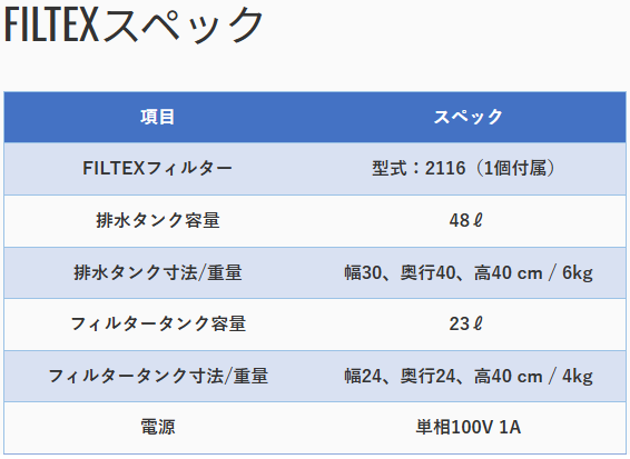 フィルテックスは面倒な作業を削減する設計もされています。まず、電源ケーブルを100Vコンセントに差し込めば運転準備完了です。タンクは全て透明なのでフタを開けて覗き込まなくても一目でタンク内の状況が解ります。フィルタが詰まると排水タンクの水位が上がりブザーが鳴ります。ブザーが鳴ったらフィルタ交換の合図です。フィルターはタンクに入っているだけなのでワンタッチ継手のホースを外してフィルタを交換して終わりです。面倒な水抜きやハウジングを外すなどの作業は一切必要ありません。
